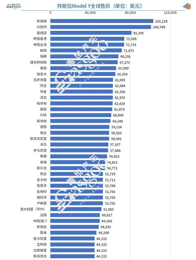 这里放一张由盖世汽车整理的,关于特斯拉Model Y全球各国价格对比一览图。4.4万美元约合人民币31.6万元,特斯拉Model Y的国内售价目前是25.89万-36.39万元。