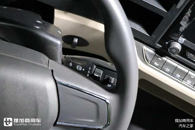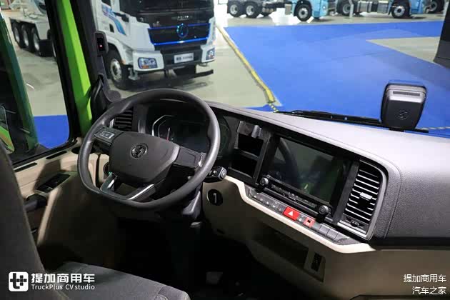 像工作台方向盘这些,和我们常见的X5000基本一致,只不过工程车不需要物流车的定速巡航,所以方向盘功能按键就只保留了蓝牙、车机和功能页的控制按键。