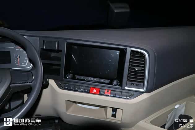工作台的配置尤为全面,自带原厂手机支架,标配车机大屏,中长运距的运输时驾驶员可以通过大屏听听歌,而且中控屏还可以实时检测货箱举升状态和四路影像,有利于提升安全性。空调系统同样也集成在大屏当中,下面保留调节的机械旋钮。剩下的按键采用琴键式布局,在大屏下方排成一列,电瓶断电开关同样集成于此。