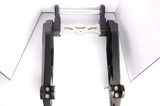 原装平叉除了限制了可安装的电机尺寸之外,还限制了可选用的避震,从上图中可以看到,后避震上下两个安装点都是通过螺母来固定的。但如今许多主流品牌推出的避震,都是采用上螺母下“芯孔”的设计(所谓的芯孔其实就是从螺母换成了螺杆固定),因此不更换后平叉的话,要想更换更长、大品牌推出的避震就又会变成一个问题。