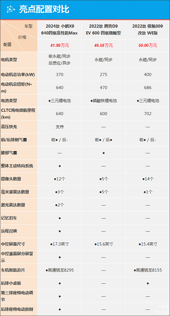 配置对比环节,尽可能选取三款价格相近的车型进行对比,其中小鹏X9和腾势D9 EV参与对比的均为顶配车型,而极氪009只能选取入门车型。通过配置对比来看,三款车型均搭载前后双电机以及电动四驱系统。其中,腾势D9 EV配备了磷酸铁锂电池,因此续航能力相对一般。其余两款车型则采用三元锂电池,极氪009在CLTC纯电续航里程数值方面稍稍占优。其他配置方面,腾势D9 EV在被动安全方面表现突出,配备了后排侧气囊和膝部气囊等同级别罕见的配置。小鹏X9则在驾驶硬件和驾驶功能方面处于领先地位,全车传感器数量多达17个,并且提供了记忆泊车和远程召唤等智能化配置。此外,该车还配备了整体主动转向系统,其所搭载的XOS天玑智能座舱系统还支持中控液晶屏分屏显示,在驾驶操控和座舱体验方面明显强于另外两款车型。