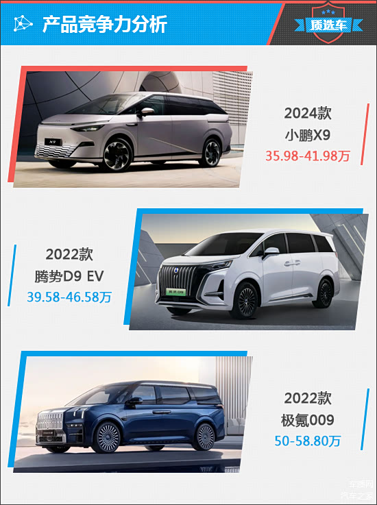 从价格来看,极氪009定价相对较高,即便是入门车型售价也明显高于小鹏X9和腾势D9 EV的顶配车型售价。小鹏X9的起步价虽然略高于腾势D9 EV,但最高售价低于腾势D9 EV,综合性价比不错。车型数量方面,小鹏X9提供了4款配置,多于腾势D9 EV的3款和极氪009的2款,选择余地更为丰富。
