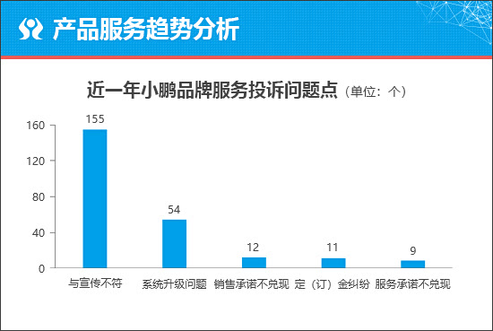 从服务投诉问题点来看,“与宣传不符”投诉量相对较高,通过进一步分析可知,该问题主要来自于小鹏P7车型。此外,部分消费者反映小鹏品牌还存在“系统升级问题”和“销售承诺不兑现”等问题。