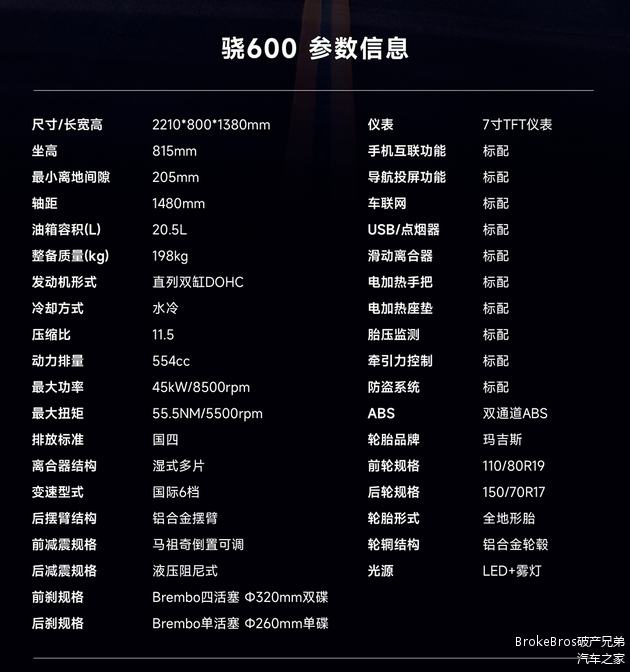第一代骁600搭载了赛600上那台经典4缸机,拥有QJ骁系列的典型家族外观。而昨天发布的第二代骁600则完全跳脱出了第一代车型的影子,由内而外地幻化成了一台全新的中量级ADV旗舰,奥古斯塔参与调校的270度曲轴双缸机让人充满期待,硬朗的原创外观设计加上马祖奇、Brembo等大牌配置,ABS+TC、电加热手把+坐垫、胎压监测、智能车机、防盗系统等实用配置也都成为了车型标配无需选装。至于护杠、护手、三箱等配置虽然没有标配,但这些不涉及电路系统的功能性配件交给用户自己去选择反而有了更大的自由度,丰俭由人嘛。