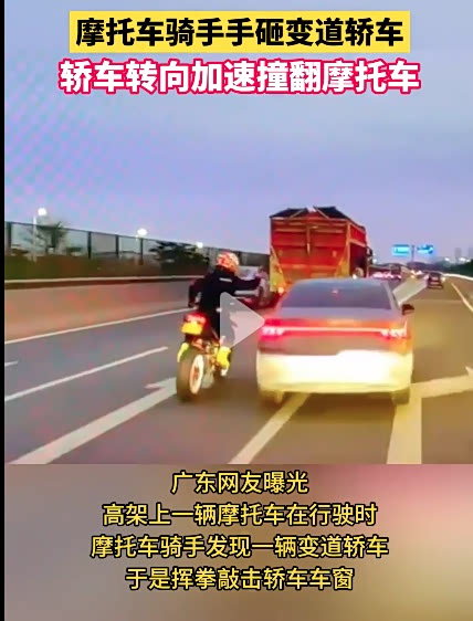 3月3日广东一高架桥上,从视频上来看,摩托车行驶在主道,被旁边的比亚迪秦plus打灯、越实线、强行变道过来,挤占摩托车道!然后摩托车手很生气,就用手拍了一下车,但是轿车继续变道,将摩托车手撞翻在地。