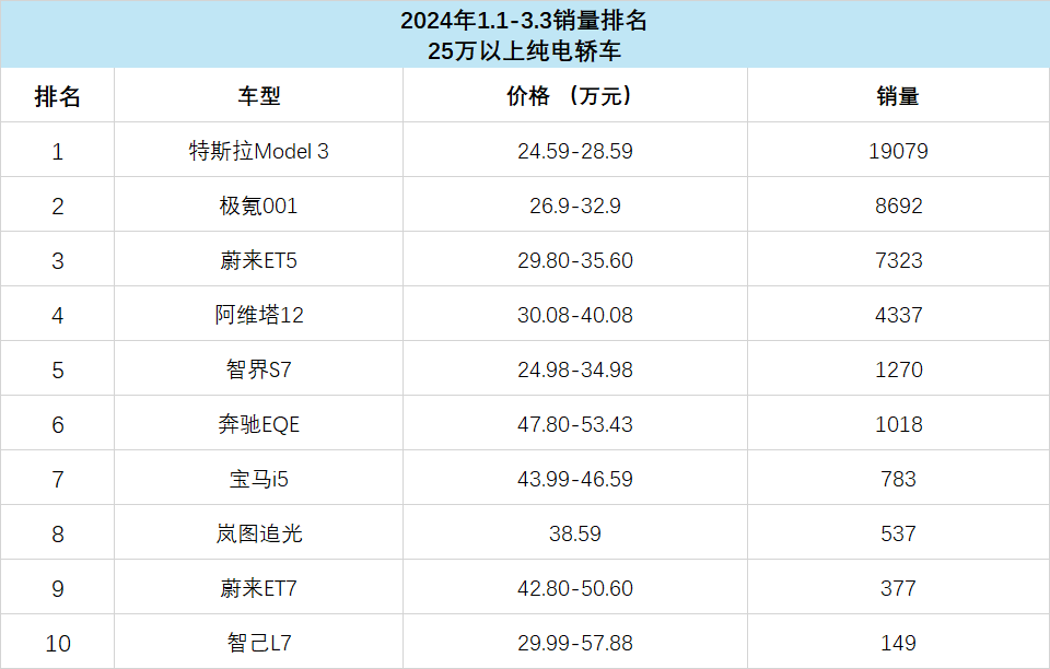 25万以上纯电轿车销量排名出炉 (2024年1月1日-3月3日):Model 3一骑绝尘,极氪001和蔚来ET5差距缩小,阿维塔12芯片受限排第四。