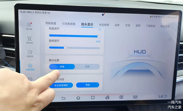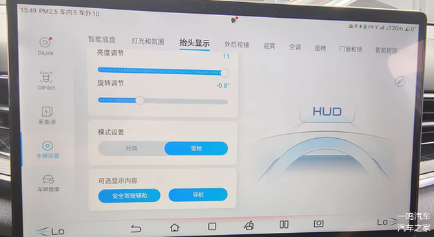 可以根据自己的需求,调节HUD的高度、亮度,还可以自行选择是否显示安全驾驶辅助、导航等标识。冬季雪天行车,为了避免HUD显示元素和雪地画面重合,打开“雪地模式”,HUD的元素就会变成蓝色,看得更清晰。