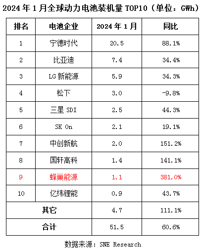 【蜂巢能源1月全球动力电池装机量排名升至第9】