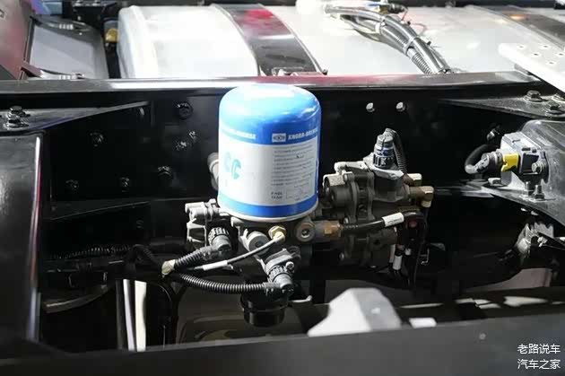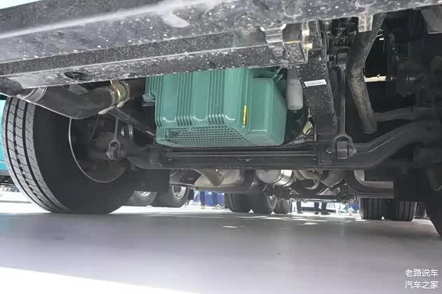 鹰途头等舱车架尺寸为300×80×8mm,车架外侧安装了美观的裙板。车架左侧布置的是蓄电池舱、生活用水箱和750L铝合金油箱,右侧布置的是尾气后处理装置、空滤、300L铝合金油箱和尿素箱。储气筒布置在车架内侧和末端,车架整体布置的非常紧凑。