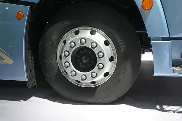 前桥减震钢板2片,装配了FAG免维护脂润滑轮端,全车使用铝合金轮圈和固特异S106 295/80R22.5型轮胎。