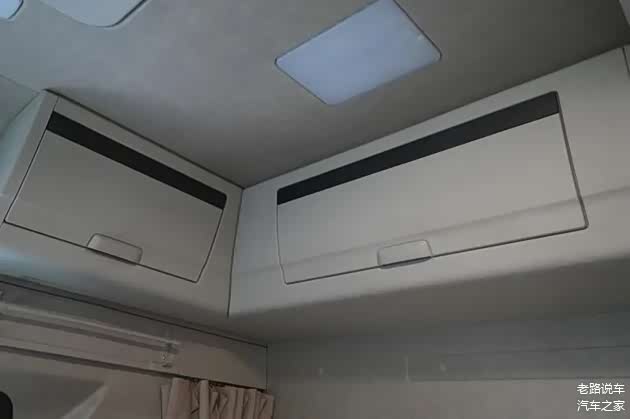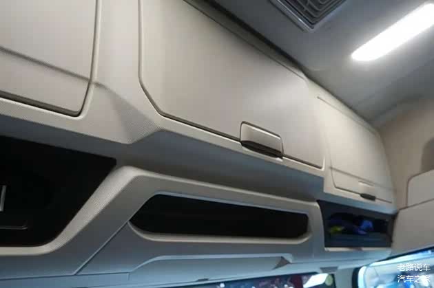 和目前常见的高顶牵引车不同,鹰途头等舱只有一个卧铺,上面高顶的位置是储物箱。