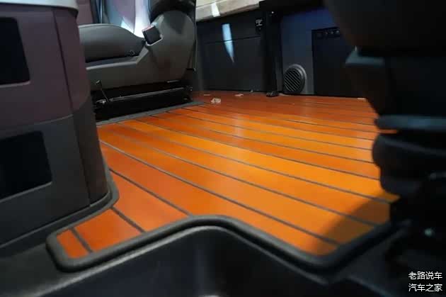 从外面能看出来,鹰途的驾驶室尺寸比普通的平头车要长一些,走上车一看真是意想不到的豪华。其驾驶室里面积多达6㎡,驾驶区配有豪华的多功能座椅和多功能方向盘,能给驾驶员带来非常舒适的工作环境。车内地垫的造型花纹和地板十分接近,是个十分有趣的设计。此外,车上有比较完善的生活设施,可以进行简单的烹饪、淋浴,可以说跟房车已经没什么区别了。