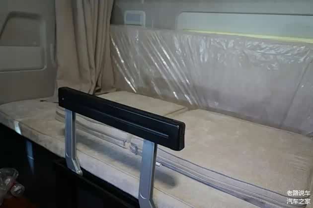 旁边是车上的卧铺,它比普通牵引车的卧铺还要大一些,可以睡下两个人。卧铺下方是暖风机、冰箱、AC 220V插座。