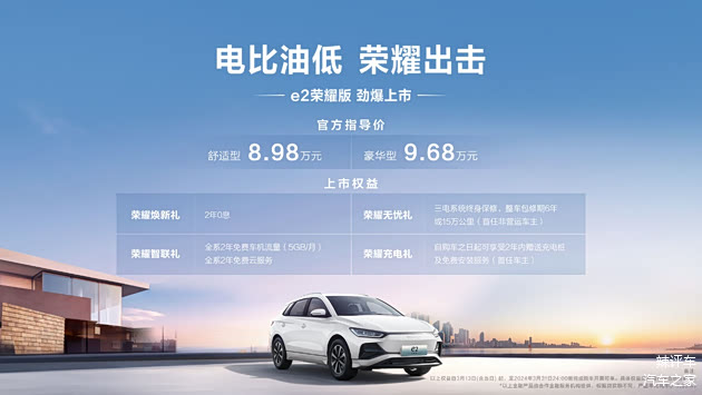 3月13日, 比亚迪e2荣耀版正式上市,共推两款车型,CLTC纯电续航里程405km,官方指导价格为8.98万元-9.68万元。e2荣耀版是比亚迪海洋网专为追求品质生活的家庭用户打造的纯电座驾,凭借全维安全、硬核高效、海洋美学、智能舒适四大优势,旨在为更多家庭用户提供更时尚、更高效、更舒适的绿色出行新体验。即日起至3月31日前,订购该车型的用户可享受2年免息、2年免费云服务等包括置换补贴、车机流量在内的多重权益大礼。