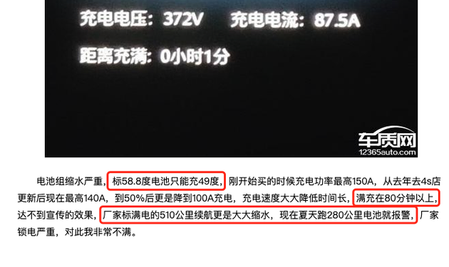 其次是充电时间长,有用户反馈说最开始的充电功率还是高的,但是去4S店给升级了之后,充电速度反而更慢了,电量从50%之后的速度还会变慢,充满电量就要80分钟,也就是一个小时20分钟,远达不到厂家宣传的效果。而且标定510公里续航,夏天实际续航也就是280公里。
