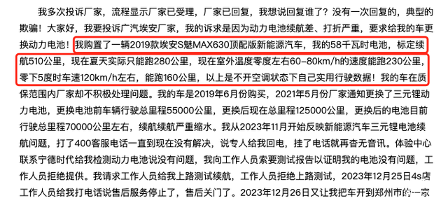首先是续航里程缩水,这是2019款,2020款埃安S普遍存在的问题,不少用户还都是来自广东等南方地区的朋友,即使冬天也不会到零下。他们普遍反馈说当时标定510公里的车,在夏天实际行驶里程也就是280公里左右,如果是零下5度的话,那么续航就只有160公里,这还是在不开空调的状态下的数据。这样的续航里程基本上就已经告别长途行驶了,也就只能在市区里转悠,像手机一样每天充电。