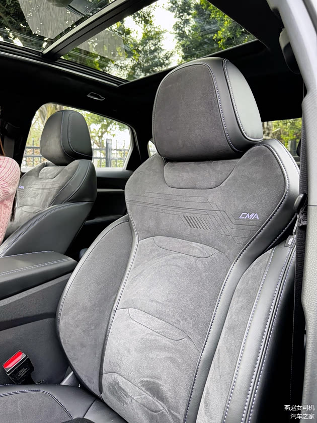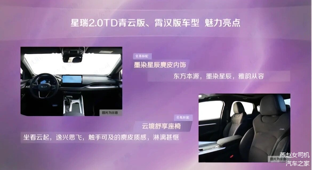 进入车内,墨染星辰麂皮内饰也是2.0TD 青云版/霄汉版的一大亮点,在延续现款车型设计布局的基础上,细节处加入麂皮包覆,兼顾豪华感与运动感,并采用凌云浮踏3D镭雕(副驾前方饰板)、紫韵星河缝线,同时还换装了云境舒享座椅,触手可及的麂皮质感+CMA刺绣。