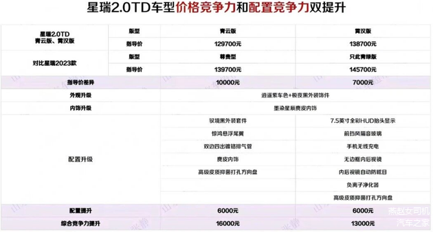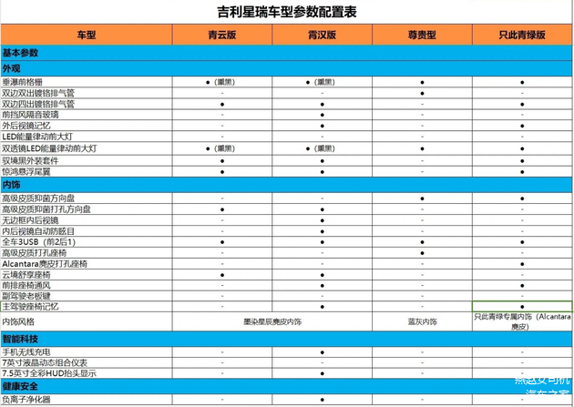 而根据曝光的配置信息显示,青云版相比现款尊贵型除外观内饰变化外,还多出了高级皮质抑菌打孔方向盘,配置提升价值6000元,综合竞争力提升16000元;而霄汉版相比现款只此青绿版还增加了7.5英寸全彩HUD抬头显示、前挡风隔音玻璃、手机无线充电、无边框内后视镜/自动防眩目、负离子净化器以及高级皮质抑菌打孔方向盘,综合竞争力提升13000元。