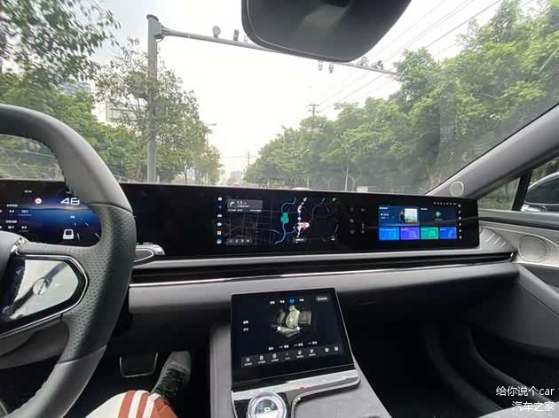 来到车内,可以发现,岚图追光PHEV的内饰设计走的是数位化风格,因为首先映入眼帘的就是横跨整个中控台的三联屏设计,不仅如此,在屏幕下方还有一个触控控制屏,用于控制空调系统和座椅调节,此外,还搭载了HUD抬头显示器,可谓是科技感满满呀!当然,这么做的缺点就是,屏幕很容易沾灰,对于一些有洁癖或者强迫症的来说,不是很友好,需要在前排放一条毛巾擦灰才行。