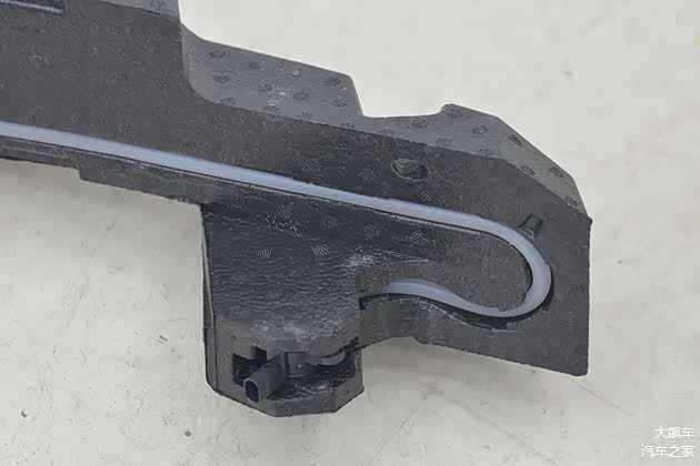 行人保护泡沫内有一根气压管,两端接有气压传感器,这是主动引擎盖弹起功能的传感器,用于保护行人。新款Model 3新增了这个功能,老款是没有的。
