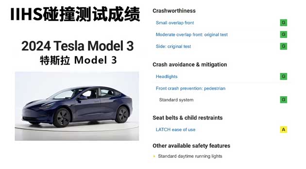 新款Model 3在美国IIHS做过碰撞测试,但只进行了小面积、40%和侧面碰撞测试,已测试部分都得到了好评。