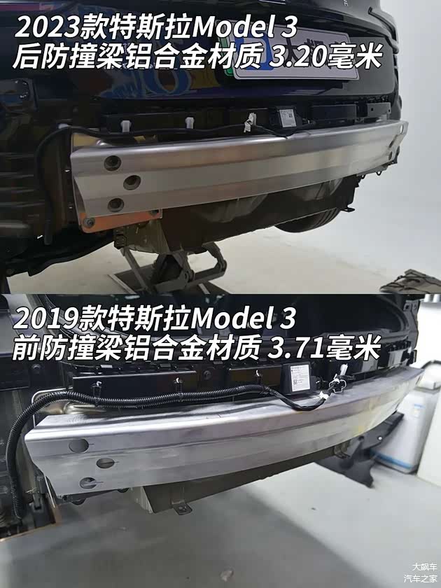 后防撞梁也与老款一样,都是铝合金材质,厚度为3.20毫米,比老款稍薄了一些。