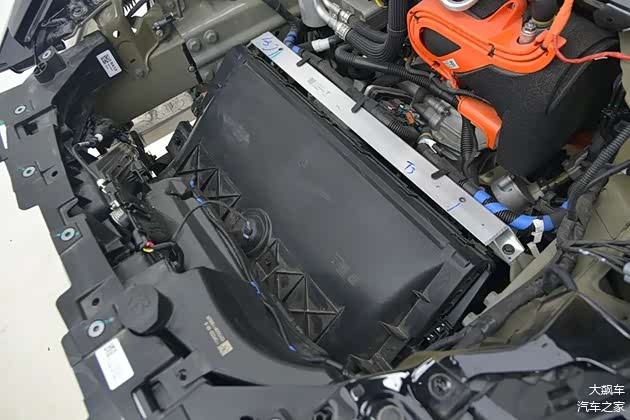 散热器开口很小,配有主动式进气格栅,之前老款是两道风门,新车变成了一道,节约不少成本。