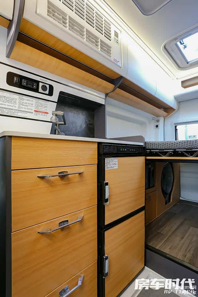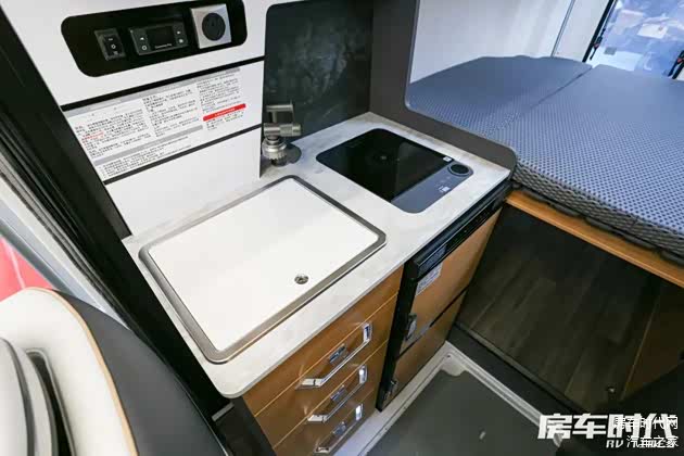 厨房区料理台面配备有洗菜池和水龙头,方便乘客在车内进行食材处理和清洗。电磁炉也占据了台面的二分之一,让乘客可以在车内进行简单的烹饪。料理台下方配备有98L冰箱,方便保鲜食物,确保乘客在旅途中能够享用新鲜食材。
