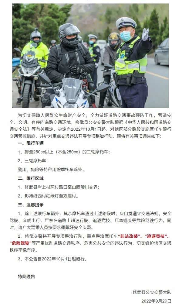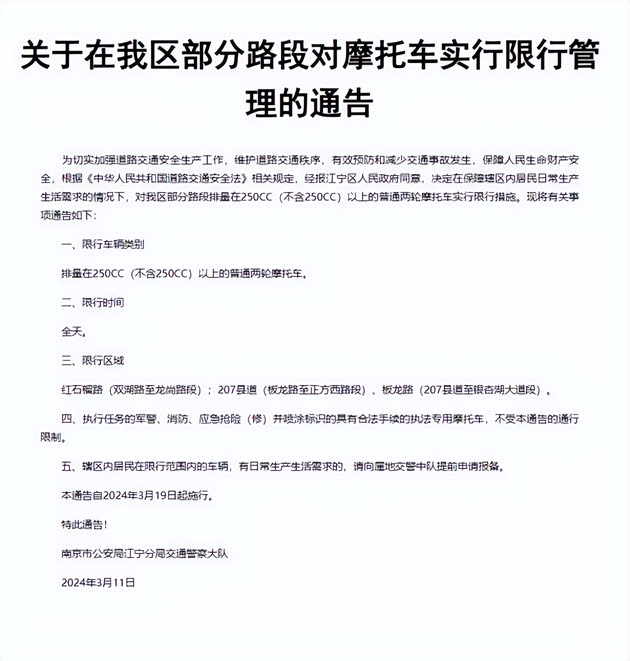 另外目前南京市、石狮市、景洪市、修武县等多个地区都出现了针对250以上车型限行的禁令,这些地区的摩友想要骑行的话,那么最大的排量也就只能选择250CC。