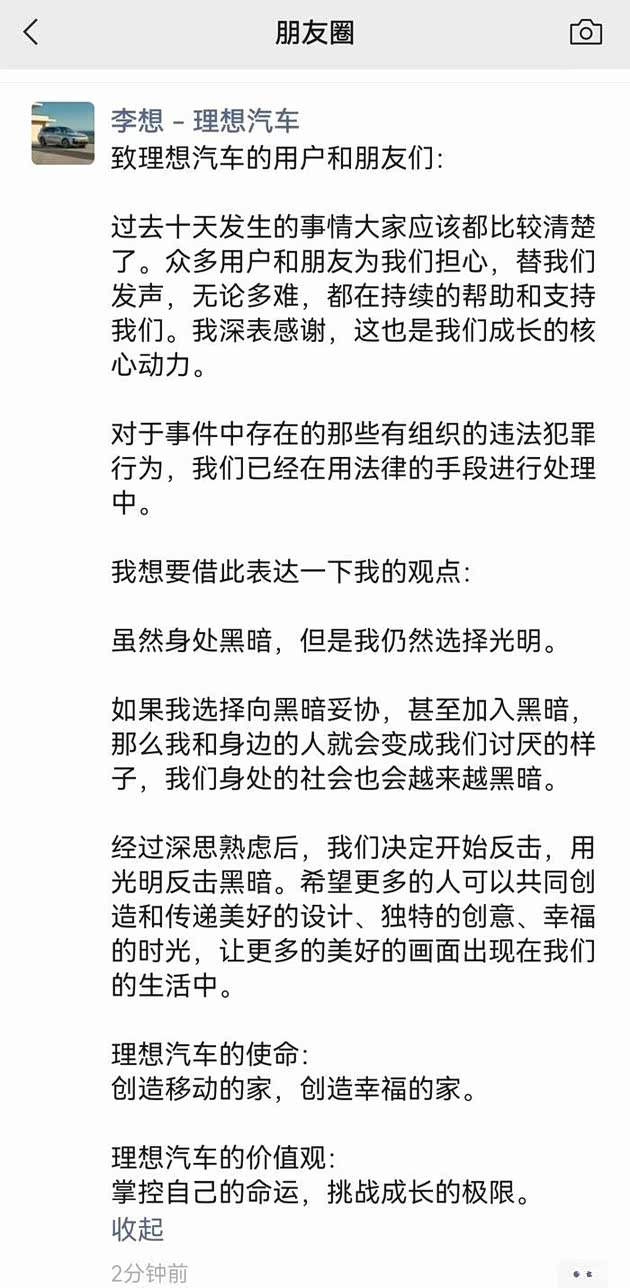 流量成就了李想,也让李想遭遇了网络反噬。从500万以内最好的SUV,乔布斯在的话,苹果汽车应该就是这样的,到MEGA P图风波,对MEGA销量产生实质的影响。理想既享受了流量的红利,也遭到了流量的反噬。令李想不得不发出“用光明反击黑暗”的怒吼,可以说是无奈之举,也是迫不得已。