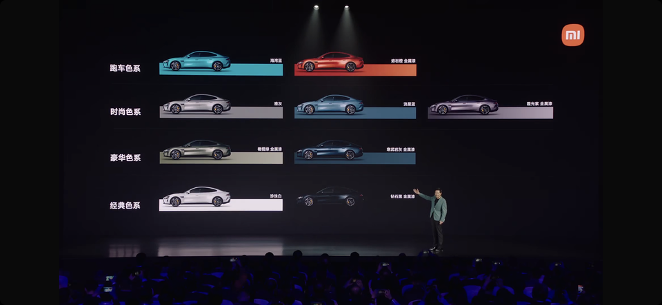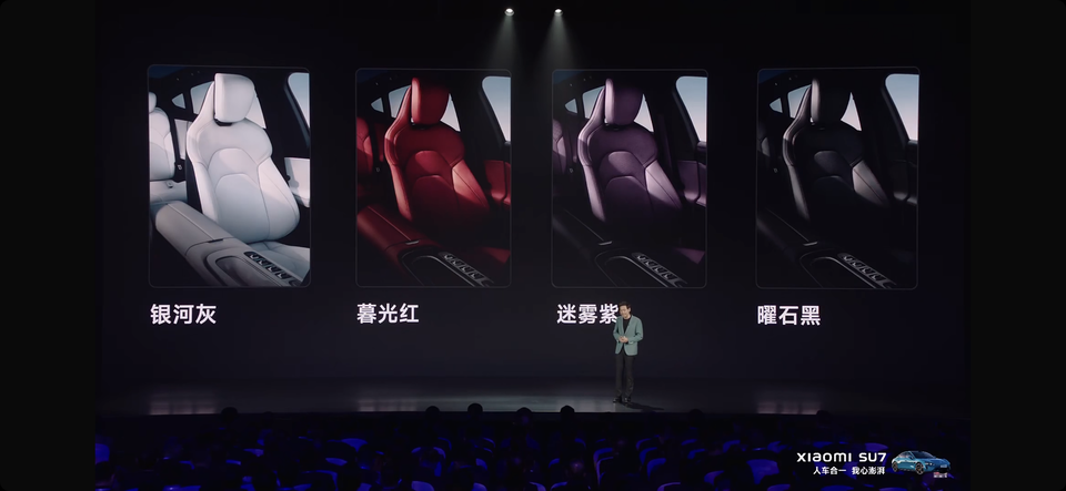 小米SU7总共9种颜色,雷布斯亲口说,雅灰是投票喜欢最多的颜色,霞光紫是给女生专门设计,寒武岩灰偏男性,橙色是小米的本色,珍珠白和钻石黑都带金属粉,内饰共四种