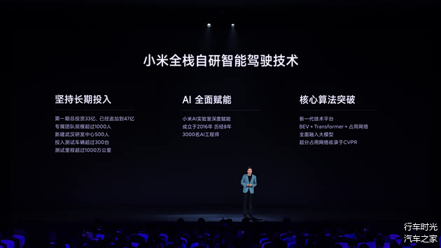 “选智能电动车本质上就是选智能科技的实力,这是大家对小米、对新能源车真正的期待。”在雷军看来,智驾+智舱+生态,将会成为小米汽车参与竞争的技术制高点。智能驾驶方面,小米智能驾驶坚持全栈自研,实车累计测试 1000万公里,小米 SU7全系标配全国都能开的高速领航、一键代客泊车和智能泊车辅助等高阶智能驾驶功能。