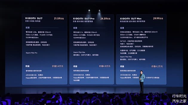 在4月30日前大定的用户,除了终身享受18000~26000元的小米智驾Pro和小米智驾Max,还将获赠包括价值2000 元的车载智能冰箱、价值 6000 元的25 扬声器豪华音响、价值 8000 元的Nappa真皮坐椅外、价值 6000 元的电动尾翼、价值 6000 元的20 英寸梅花轮毂和价值9000元的米其林 Pilot Sport EV 轮胎等多项福利,以上权益视选购车型有所差异,最高优惠超过6万元。