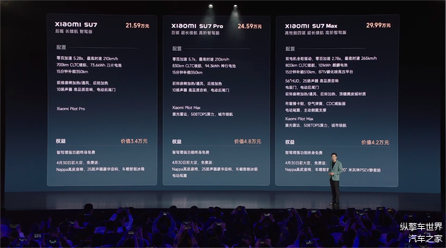 3月28日,备受关注的 小米SU7终于迎来了正式上市,新车共推出3款车型,售价区间为21.59万-29.99万元。同时,4月30日前大定,还可获赠Nappa真皮座椅、25扬声器豪华音响、车载智能冰箱等。此外,小米SU7还推出了限量5000台的创始版车型,包含基础版和MAX版两种配置,价格与普通车型相同。