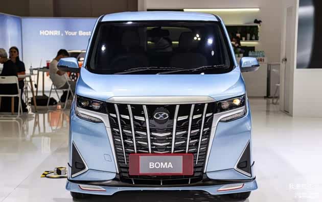 而这款Boma的最大特点,就是它那几乎百分百拷贝第三代丰田埃尔法的车头造型,两者唯一的明显差异就是尺寸和比例,其它如头灯组、水箱护罩、保险杠等造型都是如出一辙,另一个差异就是水箱护罩中间的厂徽不是丰田,而是鸿日自家的厂徽。