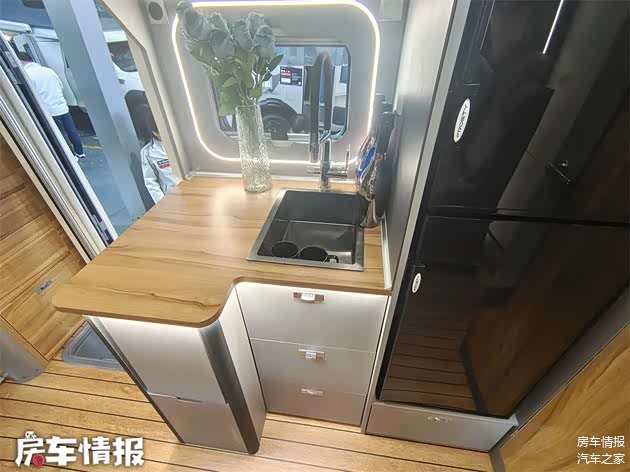 厨房一侧带有多功能洗手盆,并且搭配三合一水龙头,能够提供冷水,热水,纯净水三种用水。旁边是双开门大冰箱,可以满足食材的供应,上方还带有微波炉可以加热一些餐食。
