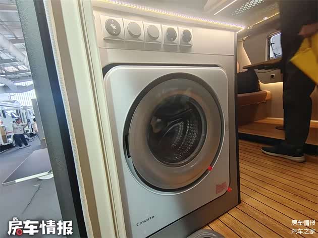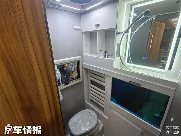 作为一款皮卡房车来说,车内的卫生间的空间已经算是比较大的了,带有固定式的马桶和翻折式的洗手台盆,上方带有淋浴喷头以及带有LED灯的化妆镜,并且卫生间还贴心的设置了暖气片,天冷的时候洗澡也就更暖和了。3kg的洗衣机被设计在进门处,晾晒衣物也更加轻松省力。