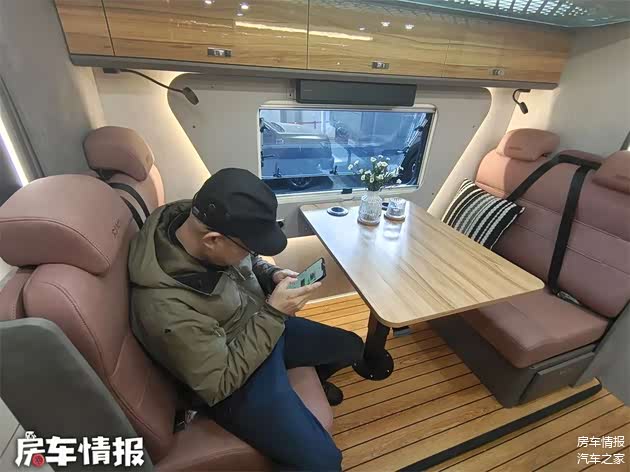 得益于侧拓展的设计,这款车比常见的皮卡房车要大了不少,车内的横向空间是非常大的,还有四人对卡座,腿部空间非常宽裕,对卡座的宽度也很合适,旁边还带有非常大的外推窗,可以保持车内的空气清新。上方还做了灯饰板和储物柜,看起来高级感满满。