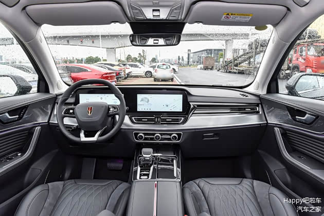 其次,红旗HS5的内饰做工用料以及配置,我觉得要比同价位的合资对手高出一大截,车内采用了时下流行的双联式大屏设计,两块屏幕的大小都是12.3英寸,看着就很有科技感,内饰用料以软性搪塑材料和皮革为主,中控台还覆盖了大面积的银色面板,并且在方向盘、旋钮以及挡把处也都使用了金属装饰加以点缀,档次感营造得同样到位。至于配置更是国产车的强项,我这台车各种主被动安全配置都很齐全,像电尾门、无钥匙启动/进入、全景天窗、手机无线充电、座椅加热通风这些常用的功能也都没有缺席,并且还带了BOSE音响。