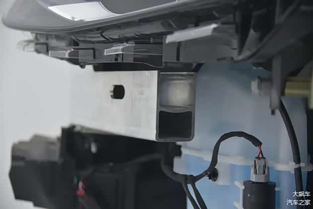 拆掉这辆车的前保险杠,能看到内部有一根铝合金前防撞梁,厚度为3.29毫米,截面呈“目”字形。和银河E8一样,为了避让大灯,上面截掉了一小段,所以从表面看截面像个“日”字形。防撞梁中间两根横梁有些弯曲,可以更好的碰撞吸能,和一些车企的欧米伽“Ω”形防撞梁设计有些类似。