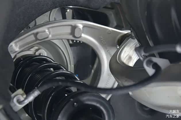 前悬是豪华车常见的双球双叉臂结构,全铝合金材质,连接盘也是铝合金的。