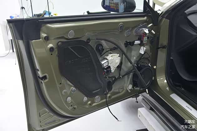 拆掉车门内饰板,前门内部大部分由钢板覆盖,贴有发泡棉密封。