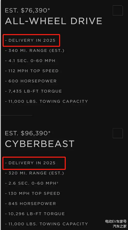 特斯拉美国官网显示,现在下订单购买 Cybertruck的车主将需要等到2025年才能收到车辆。全轮驱动版Cybertruck和高端Cyberbeast(野兽版)的预计交付时间均为2025年。特斯拉CEO埃隆马斯克曾表示,要实现每年交付25万辆Cybertruck的里程碑,需要等到2025年才能实现。