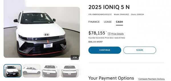 美国安大略经销商销售的IONIQ 5N标价为8.7685万美元。虽然不知道是否真的以这个价格与用户签订合同,但价格本身就引起了人们的关注。现代汽车美国法人向经销商提供的建议消费者价格为6万7685美元,也就是说经销商价格,比厂商建议价格,高出2万美元。