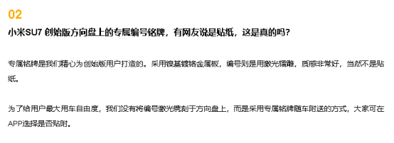 其次,小米SU7创始版的专属铭牌采用锦基镀格金属板,编号则是用激光镭雕,并不是贴纸,专属铭牌随车附送,可在APP选择是否贴附。
