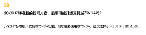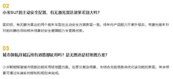 在智驾功能方面,小米汽车表示“现阶段在主动安全方面,有无激光雷达的表现一致,未来升级后激光雷达版本会更有优势”。此外,小米SU7标准版不支持城市NOA领航,仅有Pro版和Max版支持,并且该功能采用轻地图方案来实现,而非无地图。