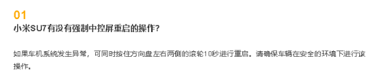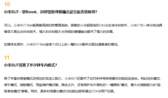 其余问题上,小米SU7强制重启中控屏的操作是:同时按住方向盘左右两侧的滚轮10秒;Max版支持连续使用“一键BOOST模式”;搭载的空气弹簧调节范围是-20至+30mm,标准位置离地间隙是134mm,离地间隙是114mm至164mm,并提供和整车一致的“5年10万公里”质保。