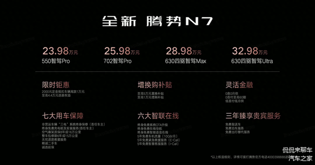 作为新能源汽车智能化下半场的开启者,全新腾势N7基于三大豪华与智电融合全面进化,也是全球首款将智能驾驶、智能底盘、智能座舱和电动平台融合的整车智能SUV,凭借云辇-A智能空气车身控制系统(双腔)、双激光雷达、双枪超充、双电机四驱、双排超舒适座舱等智电五双核心产品力,在智能、舒适、豪华等方面全面领先同级,不仅满足用户的全场景用车需求,也必将成为100万以内年轻人和年轻家庭的首选智能电动SUV,为每一次出行提供更多舒享与乐趣。