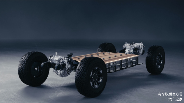 悍马EV搭载三电机e4WD驱动系统,最大输出1000马力。有趣的是悍马EV采用了“双叠层”电池包设计,容量达到了惊人的212.7kWh,同时了占据了大量的空间,车重也随即飙升至4.11吨。悍马EV搭载的空气悬架可将最大离地间隙提升至550mm,同时还配有转向角度达到10°的后轮转向系统,可通过前后同向转向实现“蟹行”。