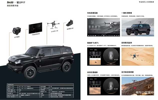 猛士科技和军车品牌猛士同属东风集团,军工背景下的猛士917天生就带着强大的气场,造型极具战斗感,同时原厂提供绞盘、伸缩梯、电动踏板后储物箱等装备。
